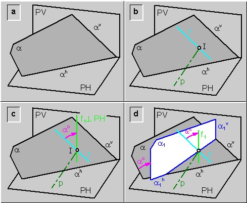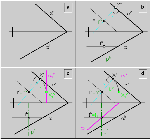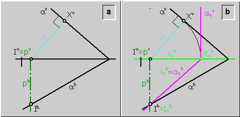 a) Por un punto (I) cualquiera del plano (a) se traza el eje de rotación (p), y una recta de máxima inclinación (i) del plano (a). Y se determina la intersección (X) de la recta (i) con el plano vertical de proyección\fig.7b.