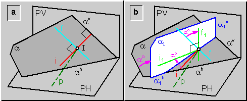 Para mayor comprensión, debe recordarse que en posición vertical (a1), el plano (a) se proyecta horizontalmente sobre una recta (a1h), de la cual ya se conoce un punto (I1h) y se sabe además que se corta en la línea de tierra con (a1v).